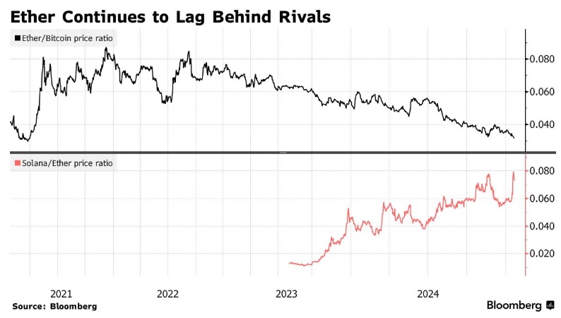 智通财经APP获悉,总市值位列全球第二的加密货币以太坊在与Solana、比特币以及瑞波币(XRP)等竞争对手数字代币的涨势竞争中节节败退,因为它似乎难以利用重返白宫的唐纳德·特朗普总统进军数字化资产市场高度投机领域所创造的顺风局势。加密货币投资者们集体涌向Solana区块链的原生代币——Solana,转而大幅抛售聚焦于去中心化金融的竞争对手——以太坊。