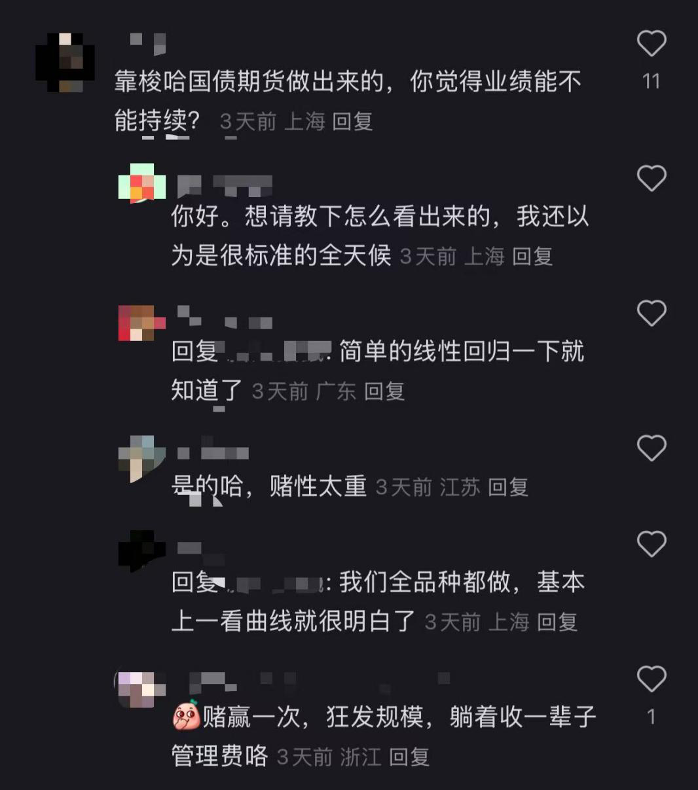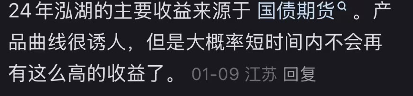 对于梁文涛所言的“多元分散化”,也有投资者提出质疑,有人表示他“all in 国债”,还有投资者更是直接表达:“靠梭哈国债期货做出来的,你觉得业绩能不能持续?”也有观点称,“去年泓湖主要收益来源于国债期货,大概率短时间内不再有这么高的收益了。”