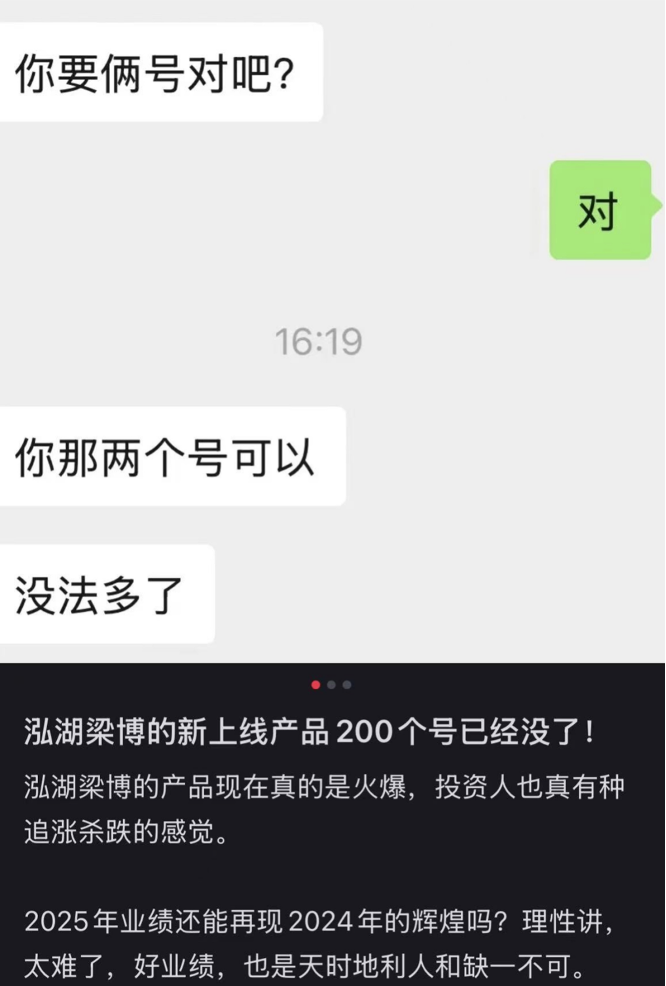 有业内人士在爆出,梁文涛的新基金产品销售火爆,投资者争相抢购。“泓湖梁博的新上线200个号已经没了!”该人士称。