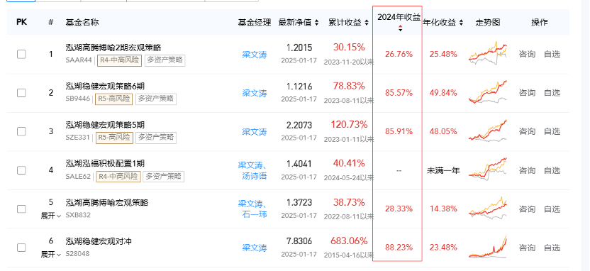 财联社记者发现,泓湖私募在2024年取得了较为亮眼的成绩,旗下产品去年收益均值达到了66.83%,收益中位数达到85.74%,突出的业绩也解释了为何新产品受到追捧。上述人士还指出,“梁文涛2024年业绩好,是天时地利人和的结果,2025年能否再现辉煌还不好说。”