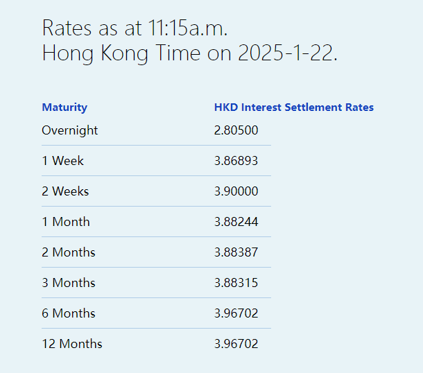 智通财经APP获悉,1月22日,港元拆息近乎全线下跌,其中隔夜拆息跌约24基点,报2.80500%,但一周拆息上涨近46基点至3.86893%。与楼按相关的一个月拆息连跌两天,报3.88244%,创近四个月新低;六个月及一年期拆息皆报3.96702%。