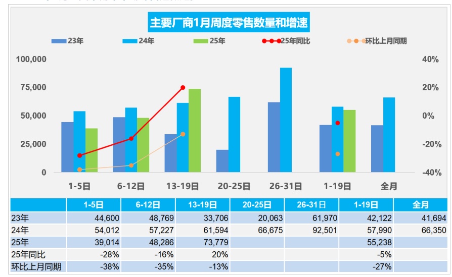 具体数据显示,1月1-19日,乘用车市场零售105.0万辆,同比去年1月同期下降5%,较上月同期下降27%,今年以来累计零售105.0万辆,同比下降5%。1月1-19日,全国乘用车市场厂商批发124.4万辆,同比去年1月同期增长25%,较上月同期下降17%,今年以来累计批发124.4万辆,同比增长25%。