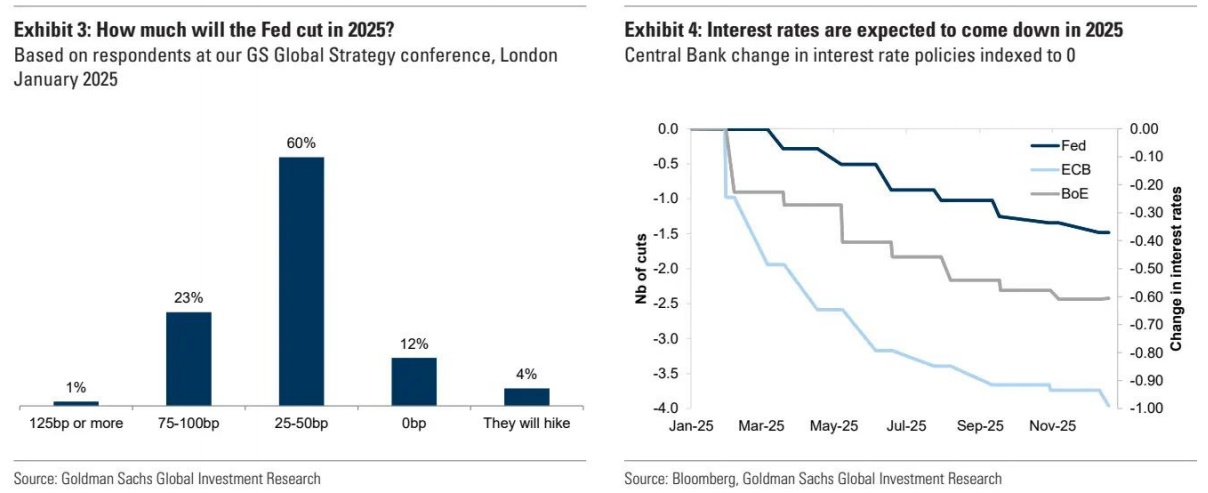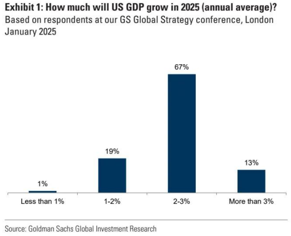 80%的客户预计今年美国GDP增长将超过2%。没有人预计会出现衰退,只有1%的客户预计美国GDP增长将低于1%。这与2024年和2023年形成鲜明对比,当时分别有27%和57%的人预计会出现衰退。这种乐观情绪可能是由于最近积极的劳动力市场数据。今天,在2025年的总统就职日,美国经济正处于健康增长和逐步反通胀的甜蜜点。高盛估计第四季度实际GDP增长了2.6%。