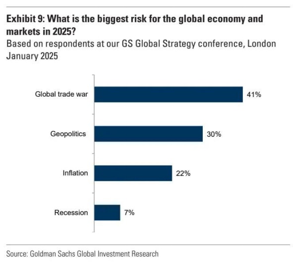 参会者称,全球贸易战是全球经济和市场面临的最大风险,41%的受访者表达了这种担忧。由于关税预期上升和特朗普当选后贸易政策不确定性指数飙升,这种担忧加剧了。30%的与会者认为地缘政治风险仍然是第二大担忧(低于去年的一半以上)。中东持续的紧张局势、俄乌冲突的紧张局势继续引起投资者的焦虑。此外,大约20%的与会者现在认为通货膨胀的复苏是最大的风险(高于去年的15%)。这一增长可能受到美国强劲的劳动力市场数据和最近能源价格反弹的推动。