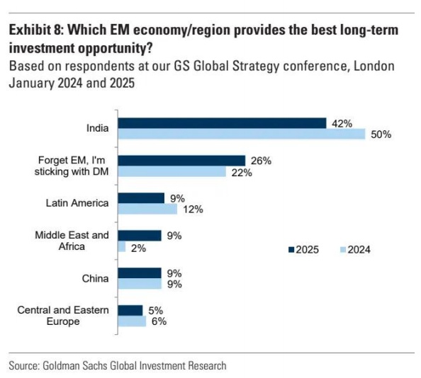 印度连续第二年被视为最佳的长期投资机会。得票率为42%,略低于去年的50%。印度将自己定位为中国的主要制造业替代品,经济学家预测其2025财年和2026财年的实际GDP增长率为6.3%。拉丁美洲的前景并不乐观,只有9%的与会者预计该地区的表现将超过其他新兴市场,低于去年的12%。大约四分之一的与会者认为,新兴市场总体政策的不确定性仍然是一个令人担忧的问题,他们认为发达市场仍然是最好的投资机会。