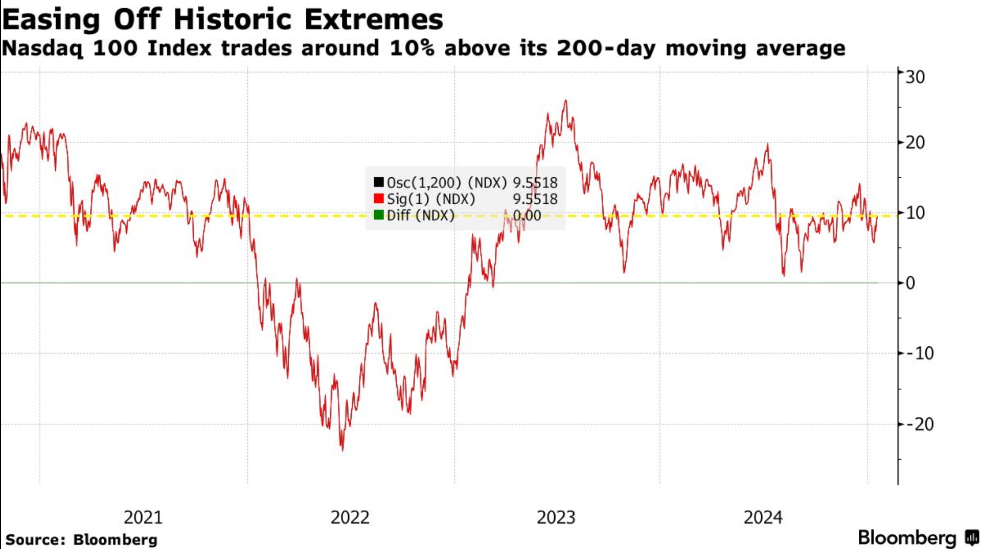 目前,该指数的交易价格比长期支撑位高出约10%,这一水平被技术分析师视为相对稳定的信号。此前,该指数在7月份曾一度高出该线20%,这一水平曾预示着夏季大跌之前的抛售。
