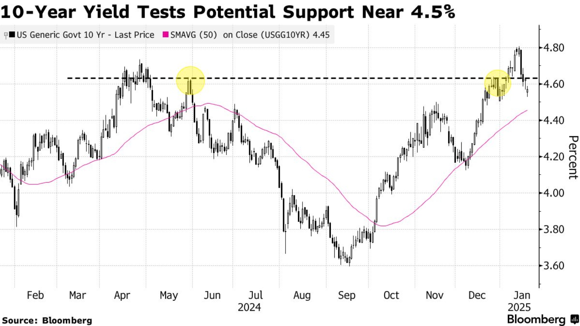 与此同时,10年期美国国债收益率在上周短暂突破4.8%(高于2024年高点)后,已下跌超过20个基点,周二徘徊在4.57%左右。对于Kolovos来说,基准债券收益率的下一个关键支撑位是4.5%,接近其50日均线和11月的高点。