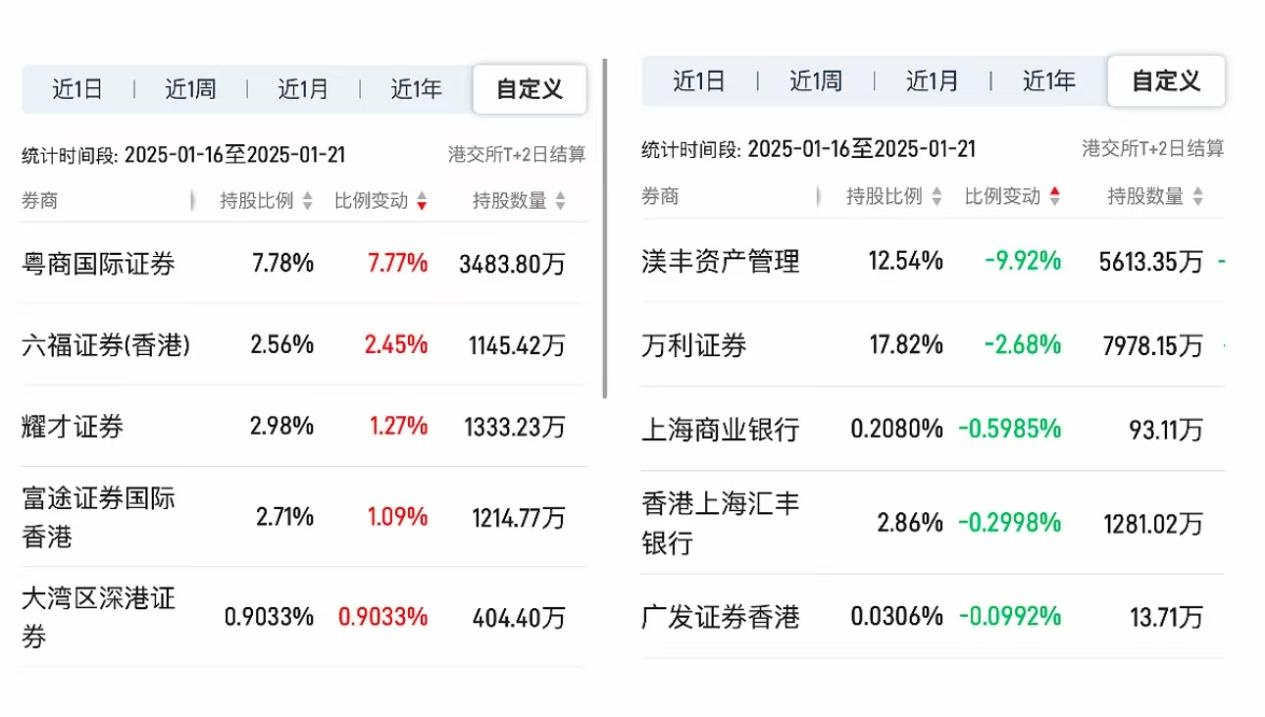 从1月16日至21日经纪商变动来看,增持前五的经纪商分别为粤商国际证券、六福证券(香港)、耀才证券、富途证券国际香港及大湾区深港证券,增持比例分别为7.77%、2.45%、1.27%、1.09%及0.9033%;减持前五的经纪商分别为渼丰资产管理、万利证券、上海商业银行、香港上海汇丰银行、广发证券香港,持股比例变动分别为-9.92%、-2.68%、-0.5985%、-0.2890%及-0.0992%。