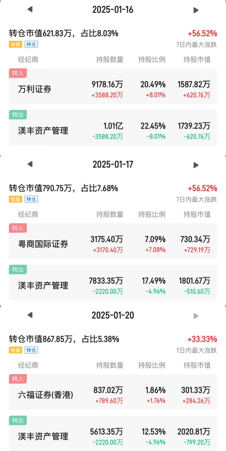 简言之,万利证券、粤商国际证券及六福证券(香港)持股比例的大幅增长,并非通过日内交易带来的增持,而是由渼丰资产管理的转仓行为所致。上述三者靠转仓分别增加3588.20万股、3170.40万股及789.60万股。