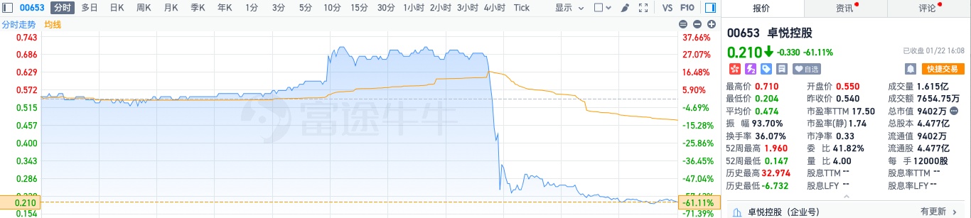 今日卓悦控股暴跌超60%,回吐了自1月17日至今全部涨幅,可谓是一朝放量回到起点。