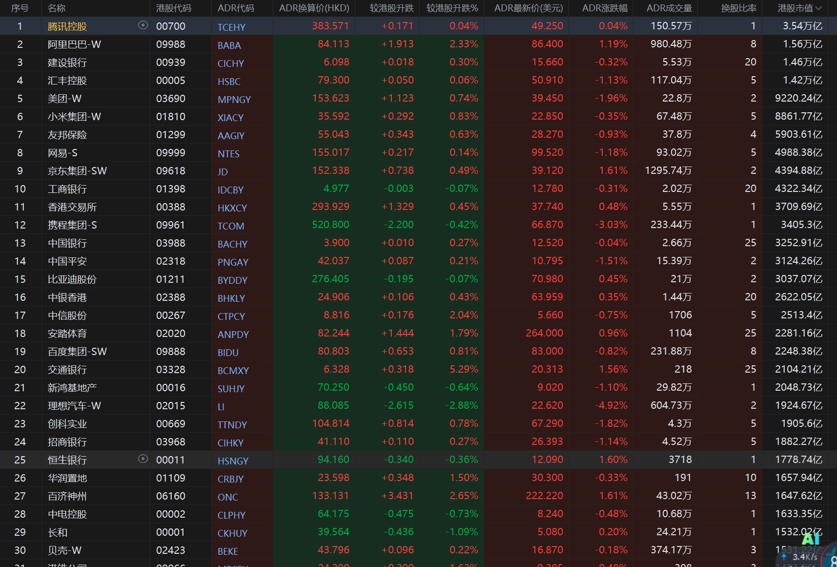 智通财经APP获悉,周三美股三大股指集体上涨,恒生指数ADR上涨,按比例计算,收报19843.08,较香港收市上涨64.31点或0.33%。