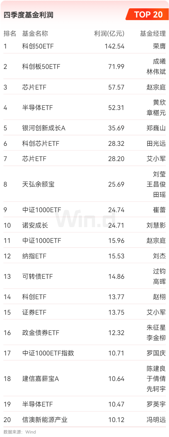 四季度公募基金整体净利润超过千亿,科创和芯片相关的ETF基金占据利润榜靠前位置。
