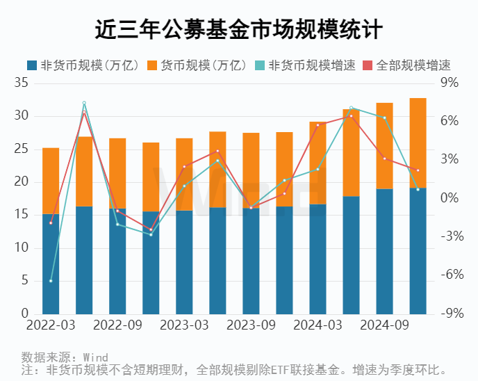 近三年公募基金市场规模保持稳定上涨。2024年四季度市场规模再创新高,突破32万亿,环比增长2.09%;非货规模在四季度的环比增速为0.46%。
