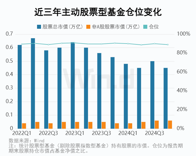 近三年主动股票型基金规模持续下降,仓位季度均值为89.75%。