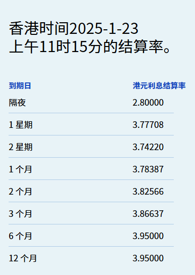智通财经APP获悉,1月23日,港元拆息全线下跌,其中隔夜息微跌至2.8%,两周拆息跌近16基点至3.7422%。与楼按相关的一个月拆息连跌三天,报3.78387%,创四个月新低,六个月及一年期拆息齐降至3.95%。