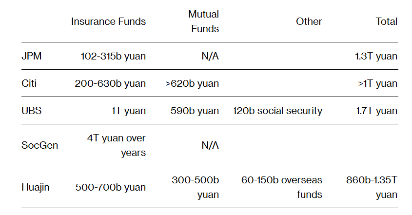 根据摩根大通的最新预测数据,今年保险公司以及共同基金公司的整体额外购买量大约为1.3万亿元人民币。该机构表示,虽然这仅占当前A股总交易市值的1.7%左右,但该机构预计三年内的新增资金流入量可能达到4至13万亿元人民币规模。摩根大通并未提供其计算方法的详细信息。