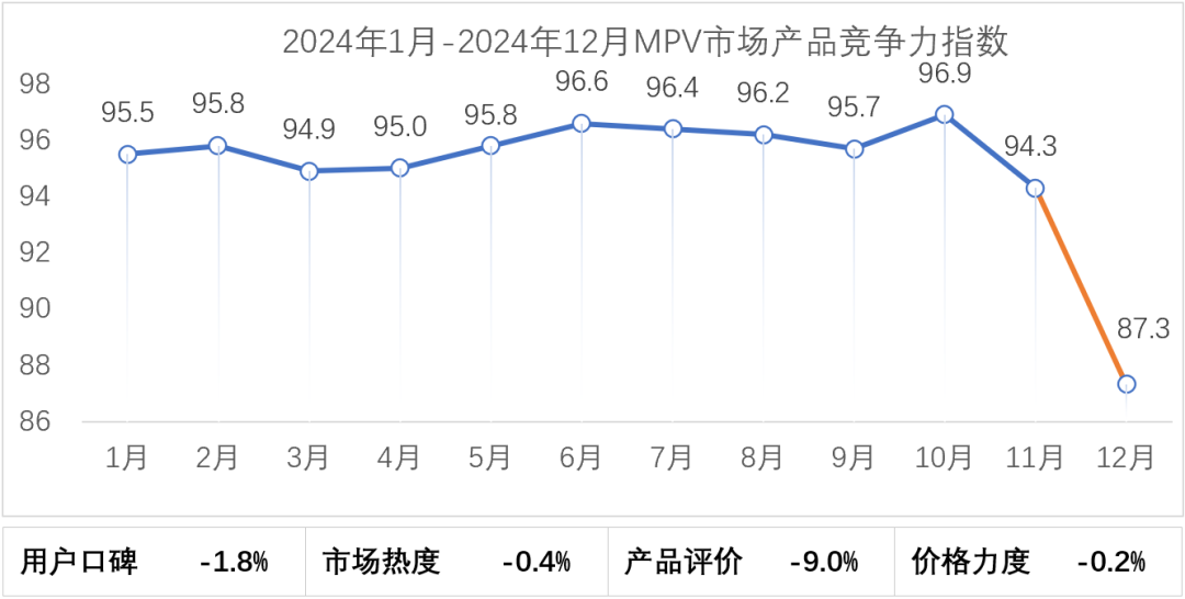 总体来看,2024年12月MPV市场产品竞争力指数为87.3,环比下滑7.0个点,其中产品评价、用户口碑、市场热度和价格力度指标环比均下滑,下滑幅度分别为9.0、1.8、0.4和 0.2个点。