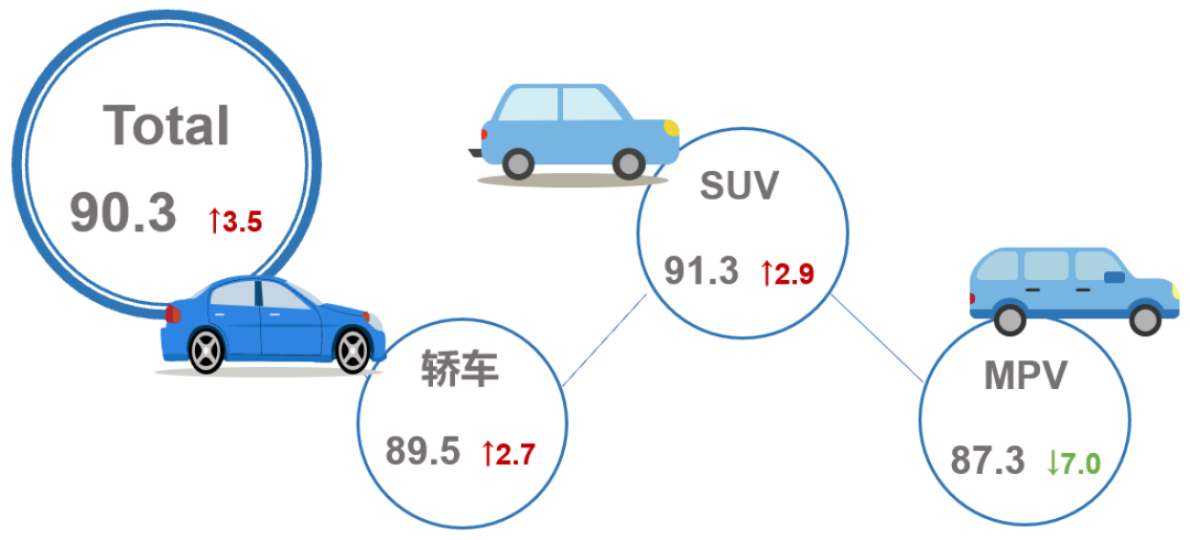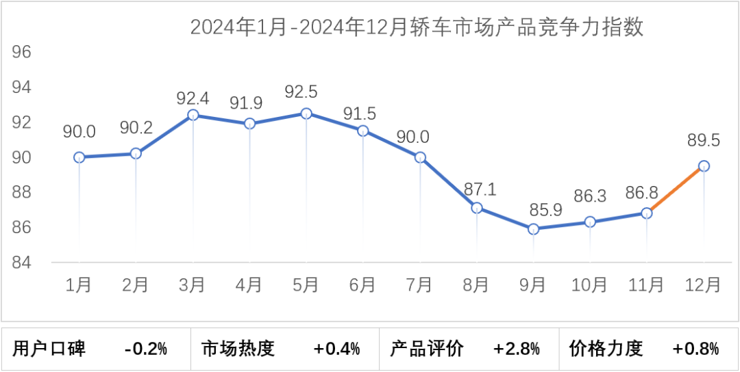 总体来看,2024年12月轿车市场产品竞争力指数为89.5,环比上升2.7个点,其中产品评价、价格力度和市场热度指标环比均上升,上升幅度分别为2.8、0.8和0.4个点,而用户口碑指标环比下滑0.2个点。