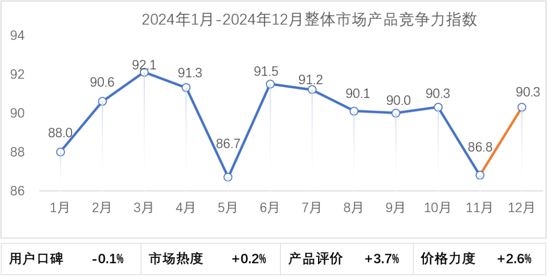 2024年12月,乘用车批发量307.5万辆,同比和环比均增长,创历年各月新高;由于年末临近,各车企发力冲击年度目标,汽车市场不断升温,且在12月底截止的"两新"补贴(以旧换新、报废更新)对政策到期的车市带来一波强力拉动,使得整体市场的市场热度环比上升0.2个点;总体来看,整体市场产品竞争力指数环比上月上升3.5个点。