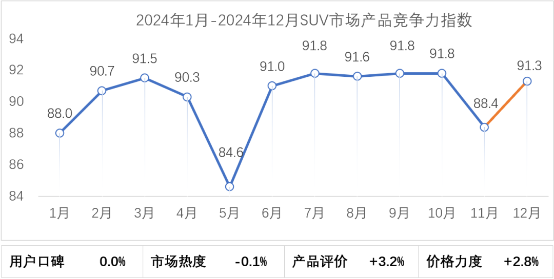 总体来看,2024年12月SUV市场产品竞争力指数为91.3,环比上升2.9个点,其中产品评价和价格力度指标环比分别上升3.2和2.8个点,市场热度指标环比下滑0.1个点,用户口碑指标环比保持不变。