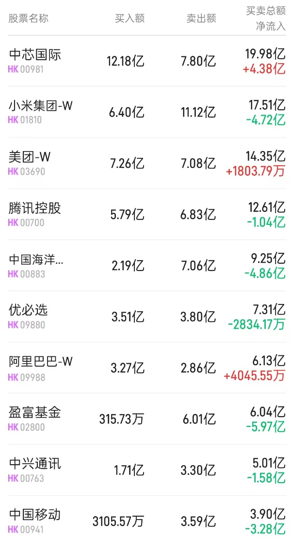 北水净买入最多的个股是中芯国际(00981)、阿里巴巴-W(09988)、美团-W(03690)。北水净卖出最多的个股是盈富基金(02800)、中国移动(00941)、中海油(00883)。