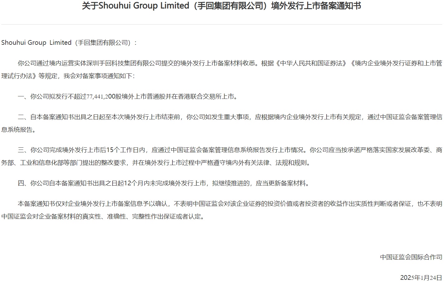 智通财经APP获悉,1月24日,中国证监会国际合作司发布关于Shouhui Group Limited(手回集团有限公司)境外发行上市备案通知书,该公司拟发行不超过77,441,200股境外上市普通股并在香港联合交易所上市。据港交所2024年7月31日披露,手回集团向港交所主板提交上市申请,中金公司、华泰国际为联席保荐人。