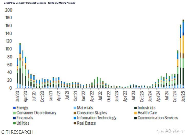 花旗研究分析师Scott Chronert在1月23日的一份美国股票报告中指出:“在特朗普的政策讨论中,关税在当前股市格局中的最终作用尤为突出。” 他发现,最近企业在季度财报电话会议中提到关税的次数激增,从三个月移动平均值的趋势图中可以明显看出这一点。