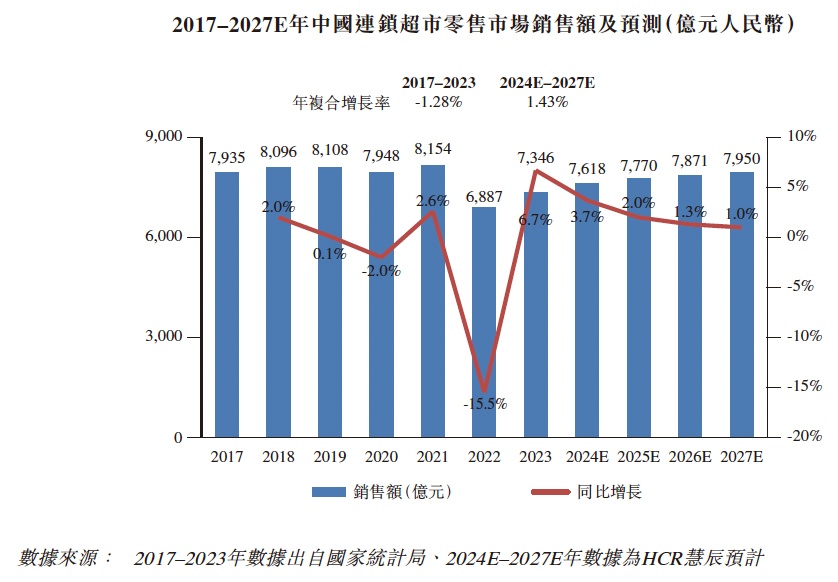 宏信龙曾经十分仰赖的零售业务的收入占比连下台阶,这或许也折射出整个连锁超市行业的困境。据了解,近年来全国范围内的连锁超市零售销售额整体呈下降趋势,2017-2023年的年复合增长率为-1.28%。同期,哪怕江苏省的综合经济实力在全国各省中名列前茅,但该省的连锁超市零售额的CAGR也同样为负数,跌幅甚至还要高于全国平均水平。