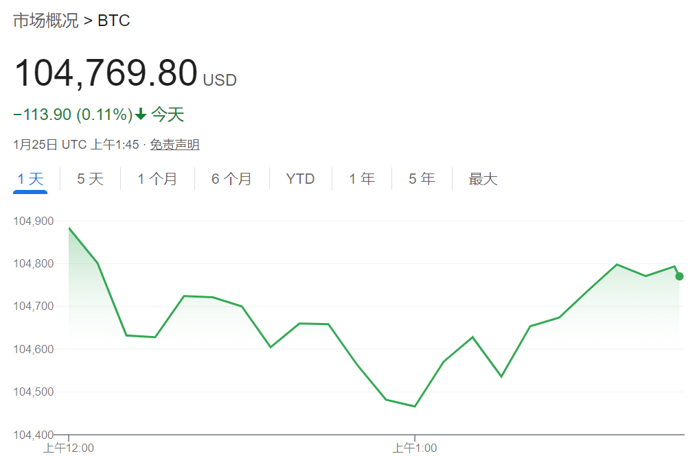 今日,比特币价格下跌0.11%,至104769.8美元左右,低于其历史最高价109000美元左右。