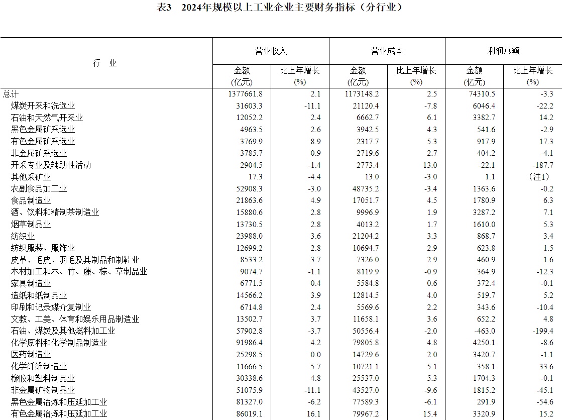 2024年,规模以上工业企业实现营业收入137.77万亿元,比上年增长2.1%;发生营业成本117.31万亿元,增长2.5%;营业收入利润率为5.39%,比上年下降0.30个百分点。