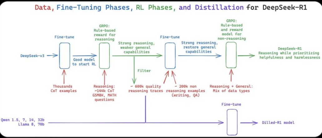DeepSeek 在完成主干预训练后,针对数学、编程、长上下文等“高价值能力”做强化学习或蒸馏精调。通过少量GPU小时的“深度强化学习”大幅提升特定任务指标,而无需对整套模型做全量高成本训练,尤其是“R1-Zero”完全不用预先提供思维链示例及复杂奖励模型,而是只用简单的“对错奖励 + 格式奖励”,便通过训练算法能让AI大模型自发地在推理过程中产生“顿悟(Aha Moment)”式的思考。