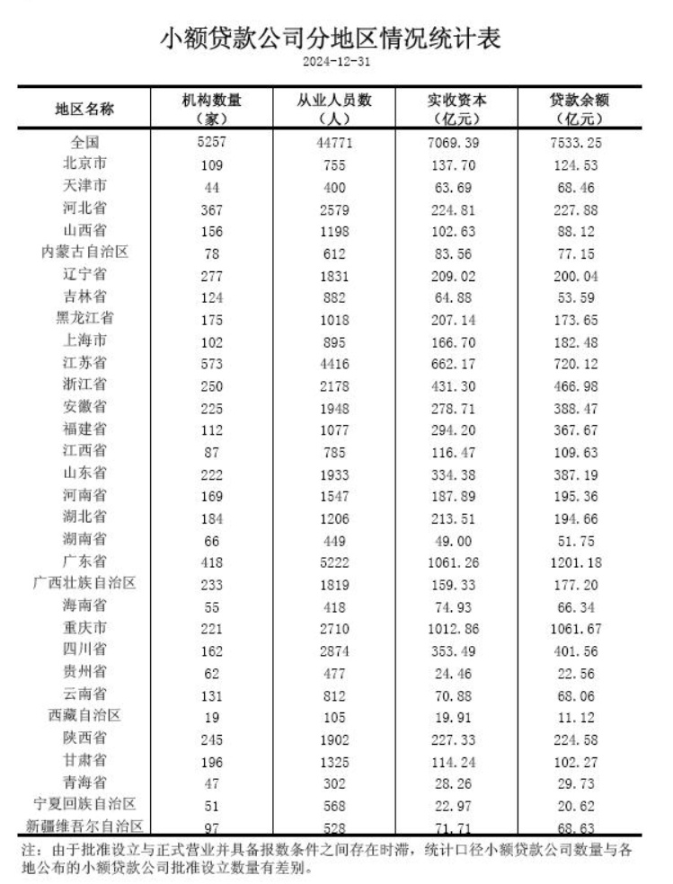 智通财经APP获悉,央行发布《2024年小额贷款公司统计数据报告》,数据显示,截至2024年12月末,全国共有小额贷款公司5257家。贷款余额7533亿元,全年减少148亿元。