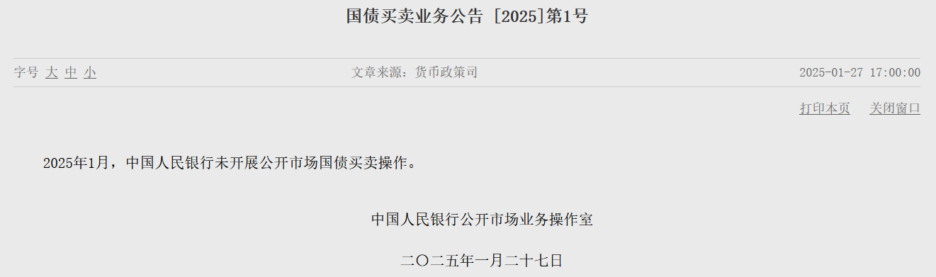 智通财经APP获悉,中国人民银行公告,2025年1月,中国人民银行未开展公开市场国债买卖操作。