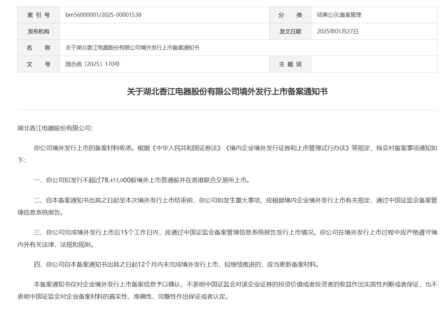 智通财经APP获悉,1月27日,中国证监会发布关于湖北香江电器股份有限公司境外发行上市备案通知书。香江电器拟发行不超过78,453,000股境外上市普通股并在香港联合交易所上市。