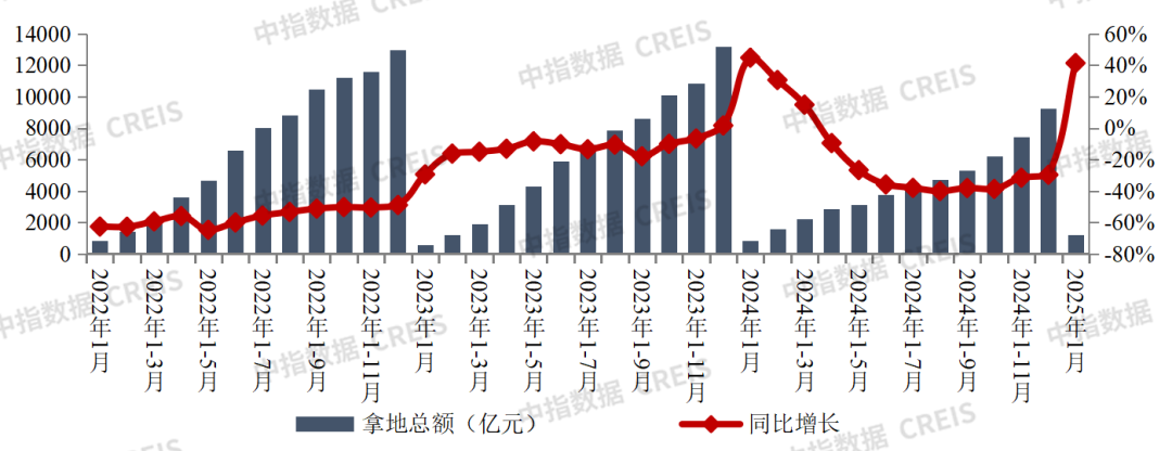 图:2022年1月-2025年1月TOP100房企累计拿地总额及同比