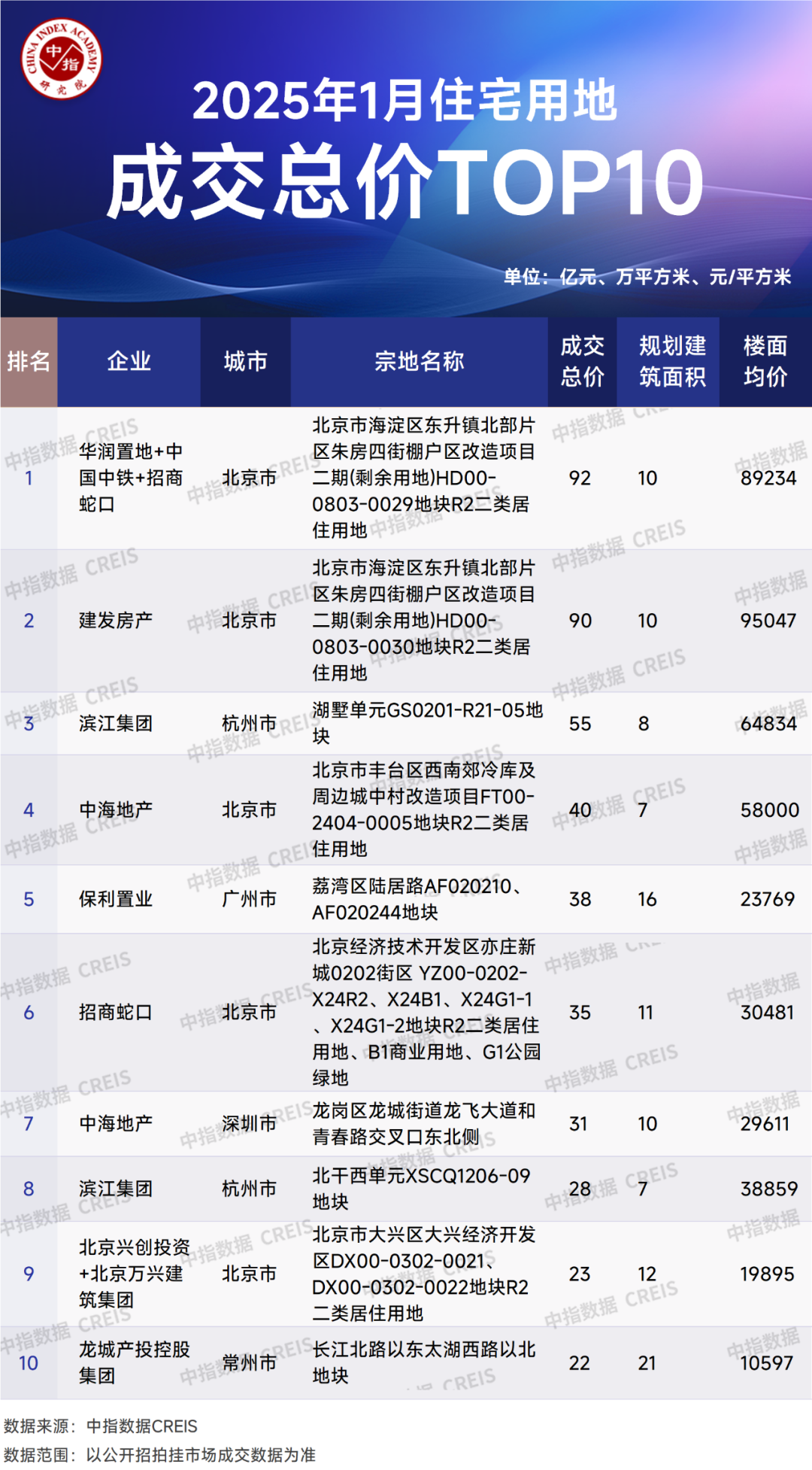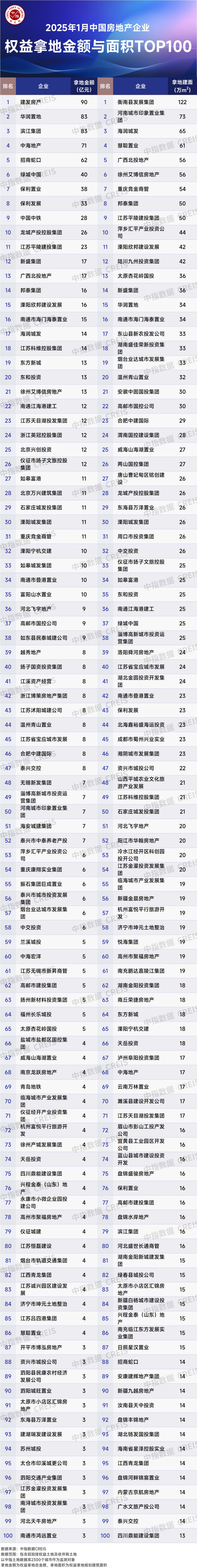 智通财经APP获悉,近日,中指研究院公布2025年1月全国房地产企业拿地TOP100排行榜。2025年1月,TOP100企业拿地总额1210.7亿元,同比增长41.4%,相较上年由负转正。政策方面,1月22日,自然资源部、财政部、央行、金融监管总局联合印发《土地储备管理办法》,明确要求,各地需依据国民经济和社会发展规划、国土空间规划,编制土地三年滚动计划,合理确定未来三年土地储备规模莫。对于三年内可收储的土地资源,要在总量、结构、布局、时序等方面进行统筹安排,结合城市更新、成片开发等工作划定储备片区,优先储备空闲、低效利用等存量建设用地。预期2025年,收储存量土地将加速。
