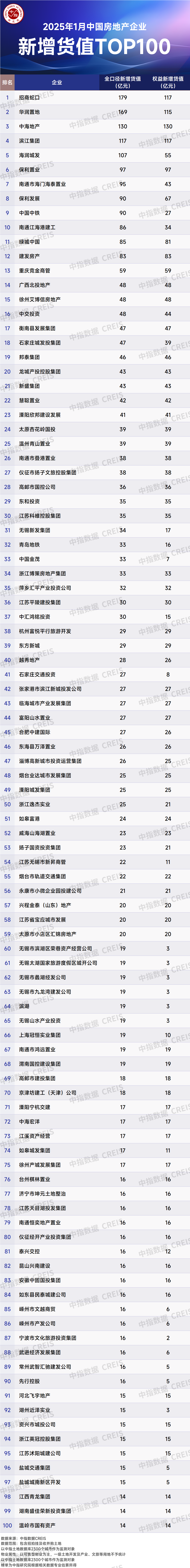 从新增货值来看,招商蛇口、华润置地和中海地产位列前三。2025年1月,招商蛇口以179亿元新增货值占据榜单第一,华润置地以169亿元新增货值位列第二,中海地产新增货值规模为130亿元,位列第三。TOP10企业2025年1月新增货值总额1160.8亿元,占TOP100企业的32.7%,新增货值门槛为14亿元。