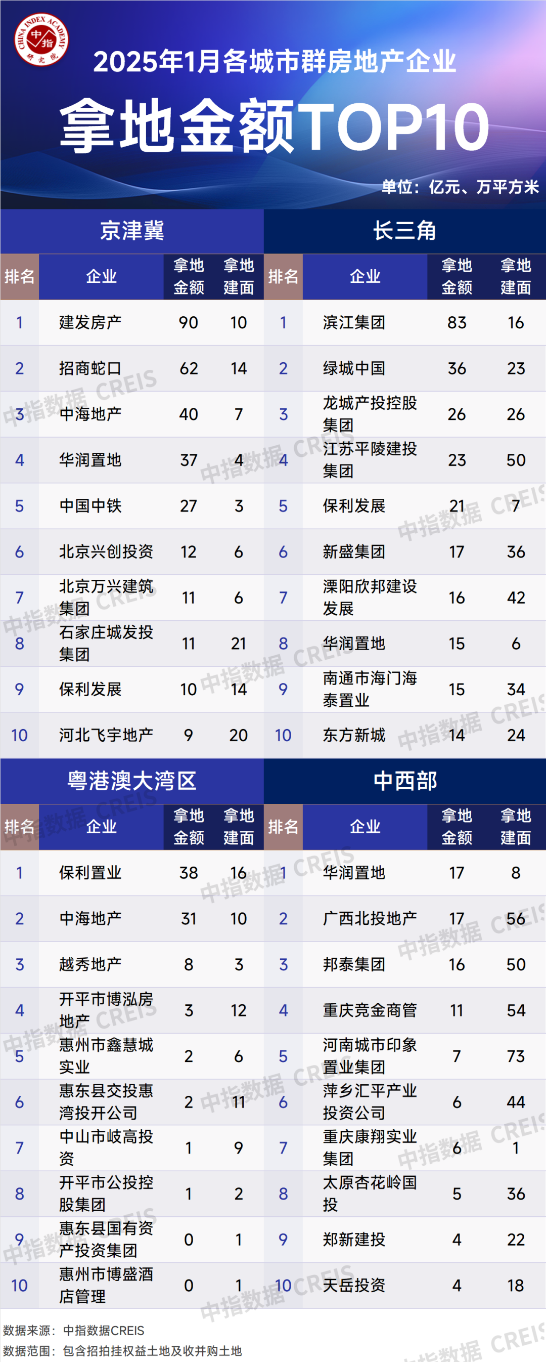 从各城市群拿地金额来看,京津冀位居四大城市群之首。2025年1月,京津冀TOP10企业拿地金额309亿元,位居四大城市群之首,长三角TOP10企业拿地金额266亿元,位列第二;中西部TOP10企业拿地金额93亿元,位居第三。