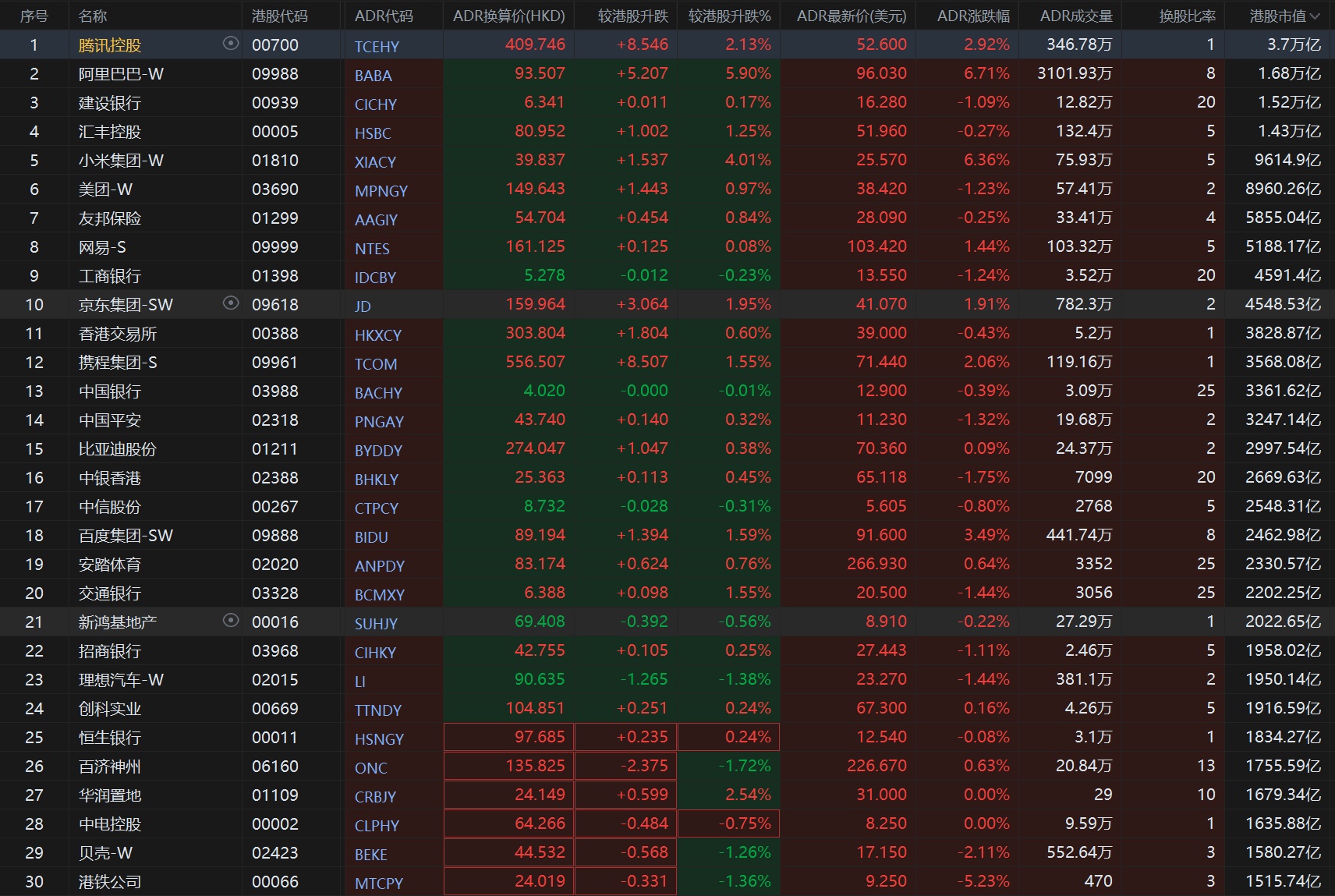 智通财经APP获悉,周二美股三大股指齐升,恒生指数ADR上涨,按比例计算,收报20441.81,较香港收市上涨216.70点或1.07%。