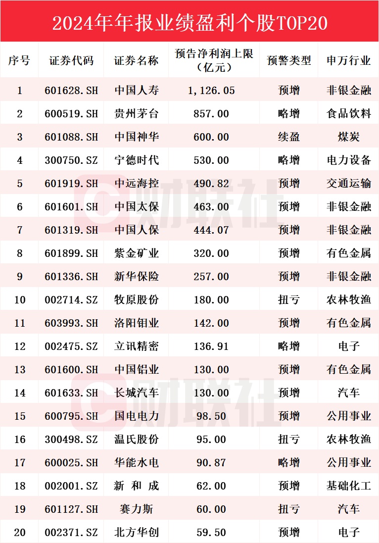 其中,中国人寿、贵州茅台、中国神华、宁德时代、中远海控、中国太保、中国人保、紫金矿业、新华保险、牧原股份、洛阳钼业、立讯精密、中国铝业、长城汽车、国电电力、温氏股份、华能水电、新和成、赛力斯和北方华创预计2024年净利润均超百亿。具体情况如下图: