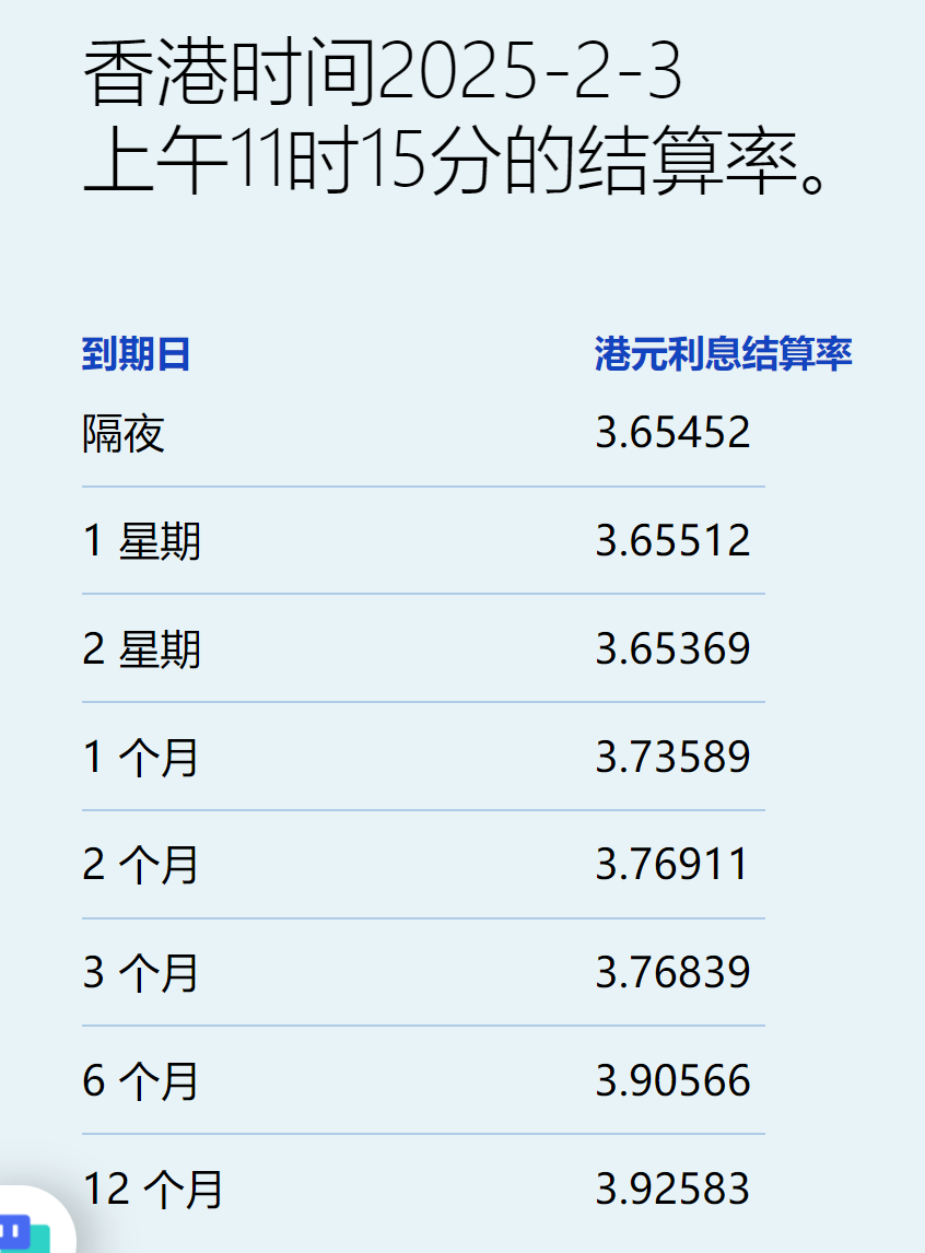 智通财经APP获悉,2月3日,港元汇价创逾四个月新低,拆息亦全线走软,其中,隔夜息大跌近72基点至3.65452%,见逾一周最低,而与楼按相关的一个月拆息连跌两天,报3.73589%,创去年9月20日以来最低。一周拆息跌穿4%,六个月及一年期分别分别降至3.90566%和3.92583%。