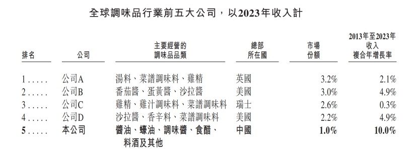 作为一家历史悠久的调味品生产商,海天味业已连续二十七年于中国调味品行业保持销量第一的领先地位。以2023年的收入计算,公司市场份额为4.5%。