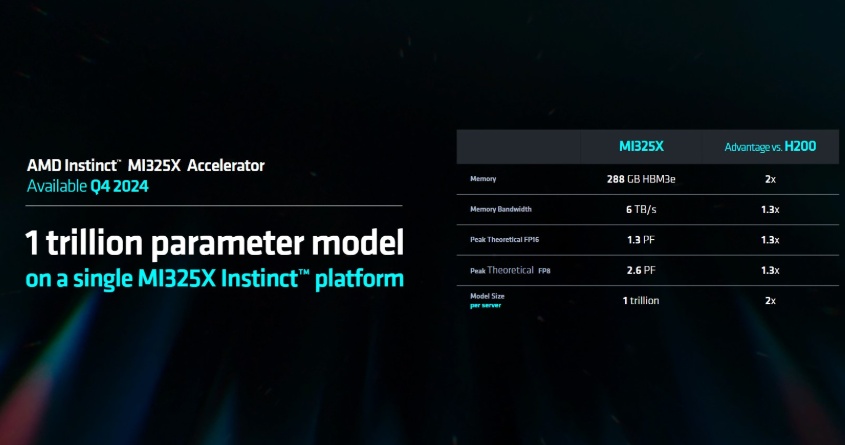 AMD全新推出的MI325X性能指标方面,基于台积电3nm制造工艺的MI325X将延续AMD强大的CDNA3构架,同时与英伟达H200一样采用第四代HBM存储系统——HBM3E,内存容量大幅提升至288GB,带宽也将提升至6TB/s,整体的性能将进一步提升,其他方面的基准规格与兼容性则基本与MI300X一致,方便AMD客户升级过渡。MI325X AI性能提升幅度为AMD史上最大幅度,相较竞品英伟达H200将有1.3倍以上提升;AMD MI325X峰值理论FP16是H200的1.3倍左右,1.3 倍于H200的内存带宽,基于每台服务器的模型大小是H200的2倍。