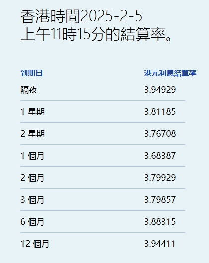 智通财经APP获悉,2月5日,港元拆息普遍微升,其中,隔夜息升至3.94929%,一周拆息升至3.81185%。但与楼按相关的一个月拆息连跌四天,报3.68387%,续创2024年9月20日以来最低。