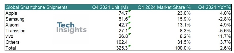 智通财经APP获悉,TechInsights发文称,2024年第四季度,全球智能手机出货量同比增长2.6%,达到3.253亿,连续五个季度保持复苏态势。然而,增长率已连续两个季度放缓至低个位数。全球智能手机批发收入达到1200亿美元,同比增长0.8%。智能手机批发平均售价(ASP)同比下降1.7%,为369美元。2024年全年,全球智能手机出货量同比增长5.7%,达到12.178亿部,智能手机批发收入同比增长2.6%,达到4080亿美元。智能手机批发ASP同比下降3.0%,略降至335美元。