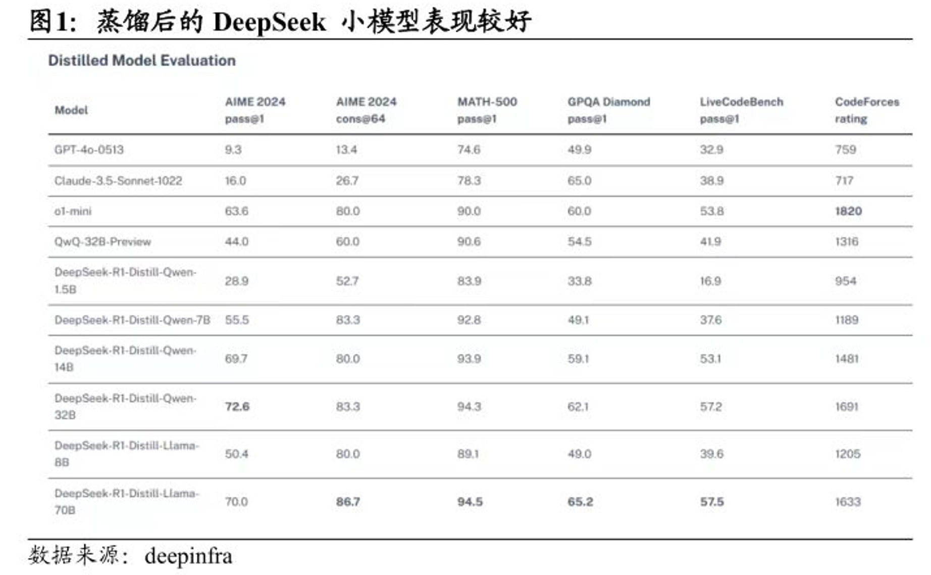 Deepseek支持本地部署的小模型表现出色,解决制约AIPC渗透的关键难题。AIPC硬件产品推出已有时日,但是预训练大模型能力有限以及基于国外厂商API调用的限制,导致用户换机动力不足。而Deepseek 蒸馏后的不同参数规模的小模型(15B、7B、8B、14B、32B、70B)具有较好的表现,参照测评结果,DeepSeek32B模型的性能表现较好,其在AIME2024基准测试中准确率达到 72.6%;在 MATH-500 基准测试中,该模型的准确率为94.3%;在LiveCodeBarometer 基准测试中,其准确率为 57.2%。Deepseek 使本地部署知识库从企业端扩展到个人用户,通过AnythingLLM 和Ollama高效且灵活的构建私有化的 AI 知识管理系统,不仅保护数据隐私 而且可以根据特定需求进行定制优化。