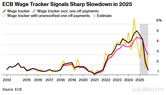智通财经APP获悉,欧洲央行的主要薪资指标继续显示,2025年欧元区薪资增速将大幅放缓,预示着通胀压力有望进一步缓解,为欧洲央行未来降息提供了更多空间。欧洲央行周三发布的薪资追踪报告预计,到2025年第四季度,薪资将以1.5%的年化速度增长,虽然比去年12月预测的1.4%略有上升,但远低于一年前创下的5.3%的峰值。