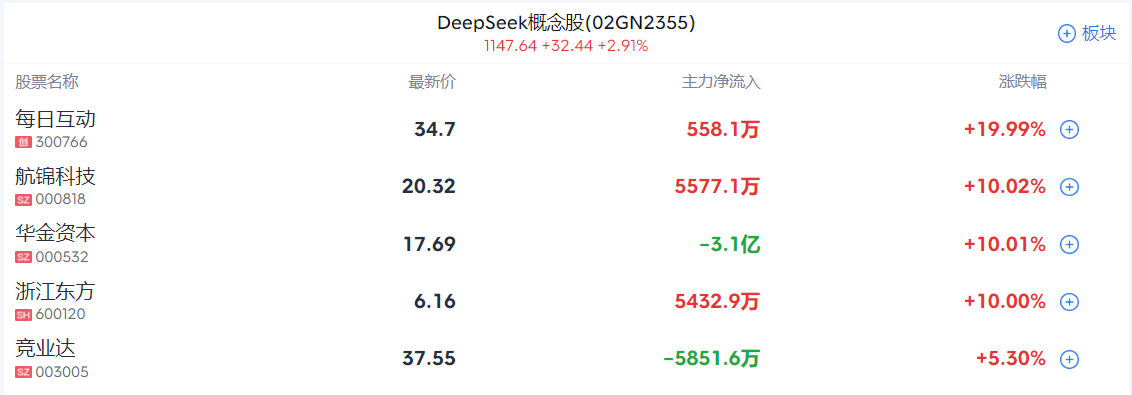 盘面上,DeepSeek概念股连续第三日大涨,华为昇腾、多模态、云计算板块继续跟涨,CPO概念超跌反弹;养殖业、医药商业、教育等板块出现回调。