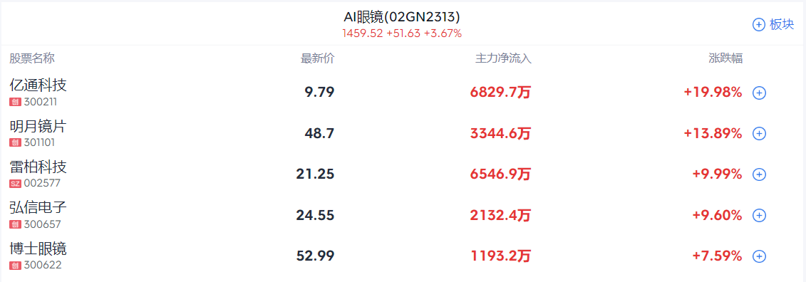 AI眼镜概念震荡走强,雷柏科技涨停,云天励飞、明月镜片、博士眼镜等跟涨。