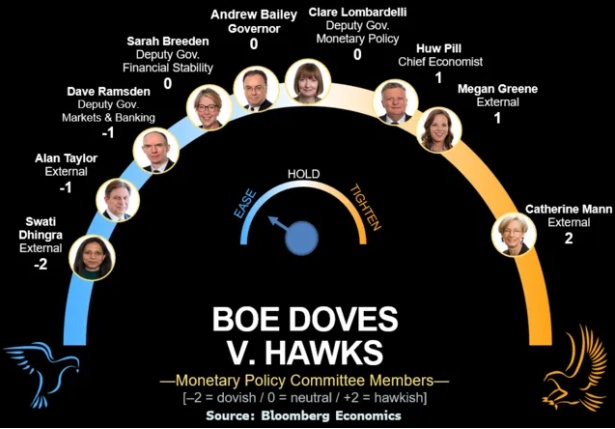在货币政策委员会的投票中,预计只有一名成员会反对降息,并呼吁将利率维持在4.75%。这位成员是外部委员Catherine Mann,她一直是最为鹰派的成员。而另一位外部成员、委员会中最鸽派的Swati Dhingra可能会投票支持降息50个基点。
